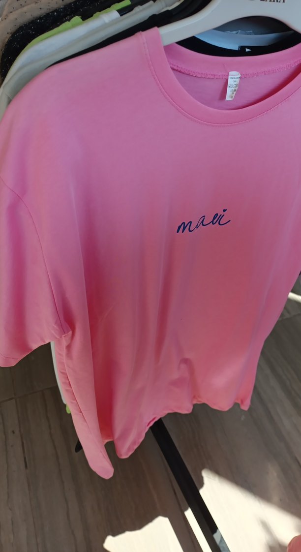 Bu bol kesim tişörtü, kısa kollu ve yuvarlak yakalıdır. Yumuşak, ipeksi kumaştan yapılmış olup, pastel pembe renkte ve "mavi" baskılıdır. Günlük sokak giyimi için uygundur.
