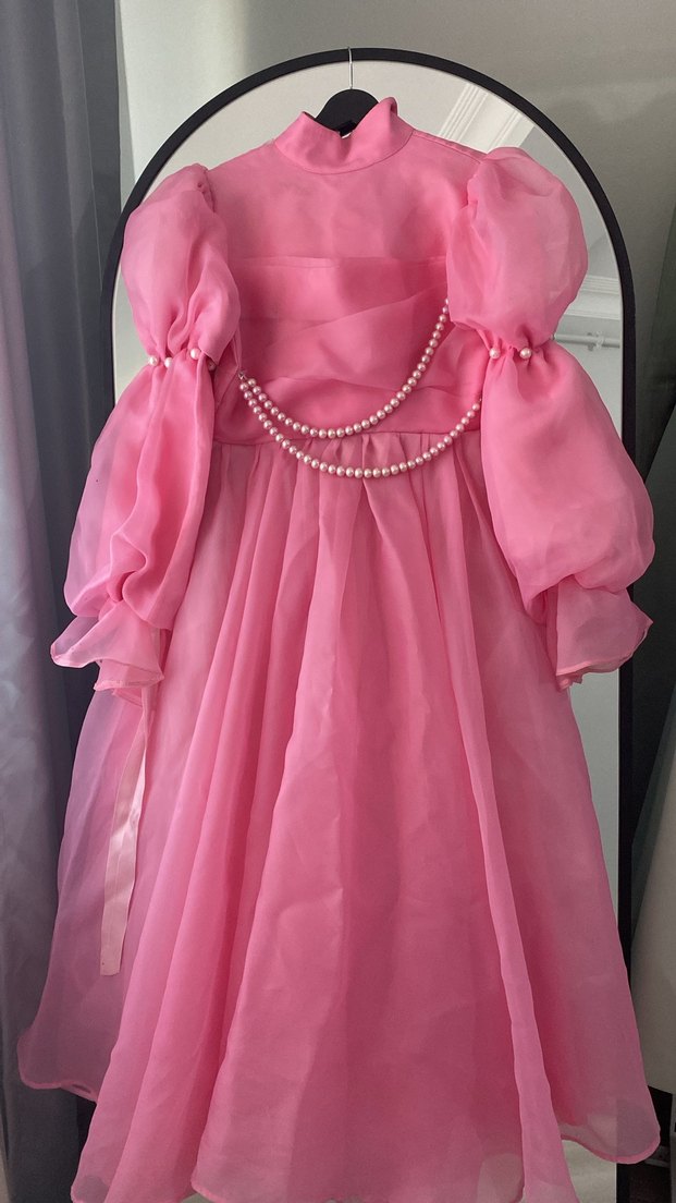 Pembe, yüksek yakalı, drapeli ve ipeksi kumaşlı, kabarık kollu, inci zincir detaylı goth ve avangart tarzda kız elbisesi.