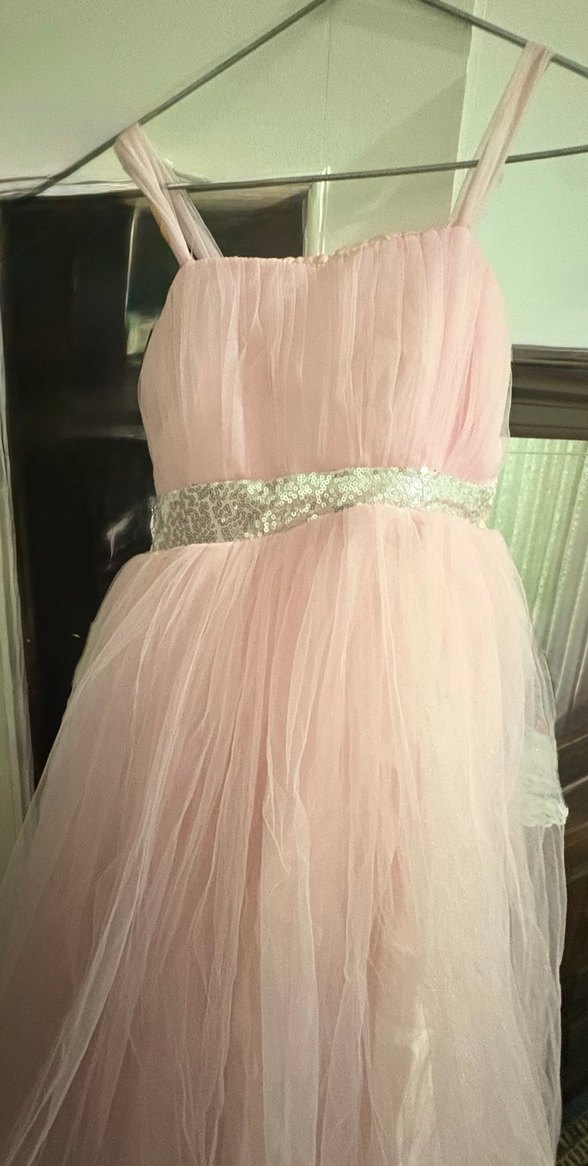 Pastel pembe drapeli, askılı, straplez kız elbisesi. İnce bele oturan bohem tarzı ve ışıltılı kemer detayı bulunur.