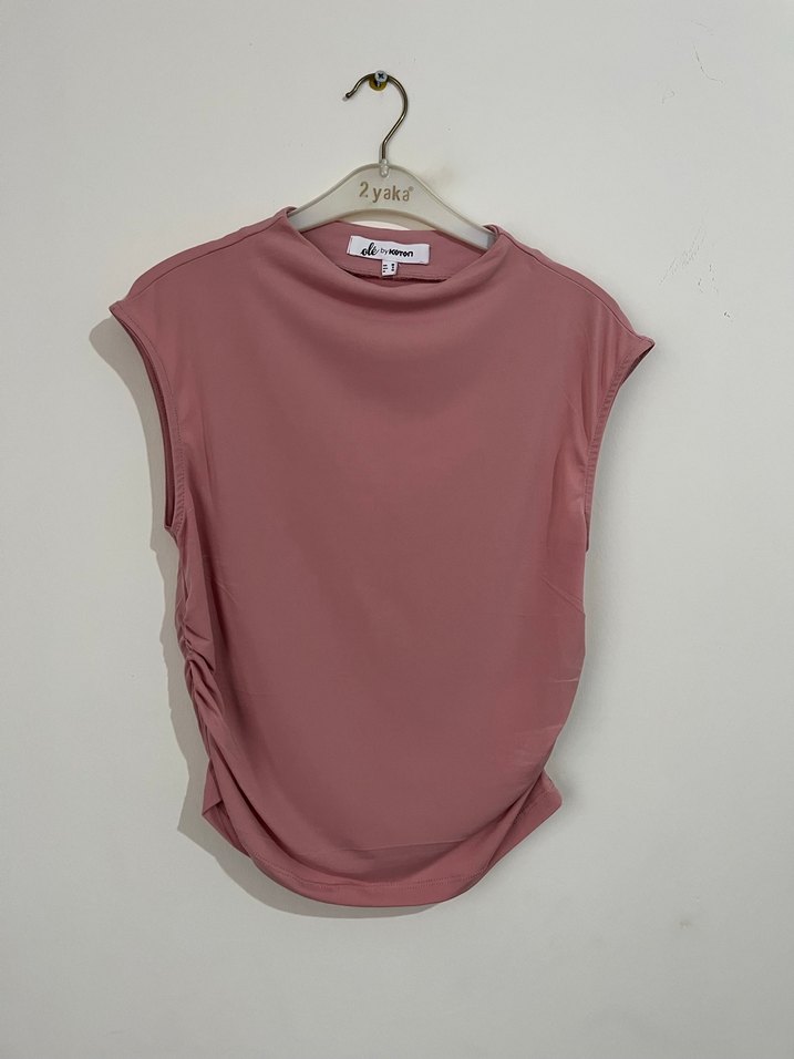 Yüksek yakalı, kolsuz ve drapeli detaylı, pastel pembe renkte sentetik kumaştan rahat kesim midi bluz. Günlük şık kombinler için uygun.
