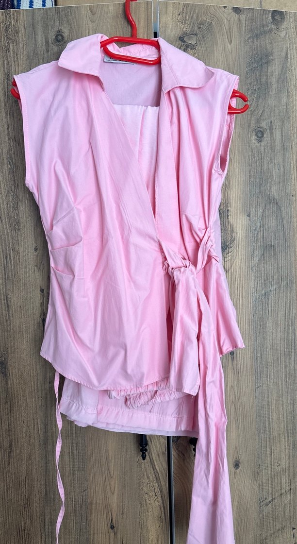 Kolsuz, pembe keten bluz, drapeli detaylı ve halter yakalı, kısa boylu ve rahat kesim, günlük kullanıma uygun. Sıfır üründür pembe massimo pantolon kombini vardır diğer ilana bakabilirsiniz
