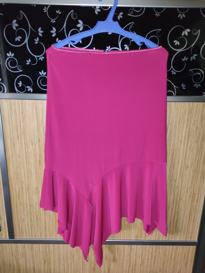 Pembe renkte, drapeli ve bol kesimli midi hamile eteği. Sentetik kumaştan yapılmış, çağdaş tarzı ile parti için uygun. Beli lastikli 38-40 beden uyumludur.