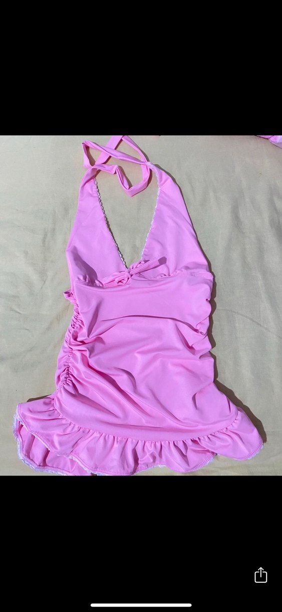 Pembe renkte, ince askılı ve drapeli tasarıma sahip, normal uzunlukta midi plaj elbisesidir. Alt kısmında volan detayı bulunur, minimalist ve cesur bir tarza uygundur.