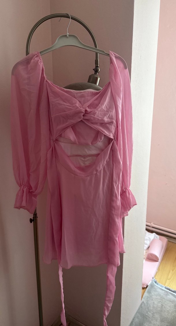 Pastel pembe renkte, drapeli detaylara sahip, askılı uzun kollu ve straplez yaka ile şık bir midi elbisedir.