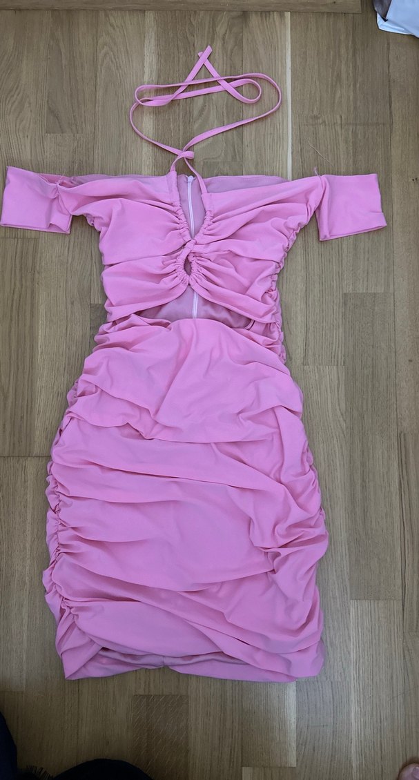 Pembe, drapeli, askılı kollu, V yakalı, mini boy, dar kesim abiye elbise. Parti için uygun, çağdaş tarzda.