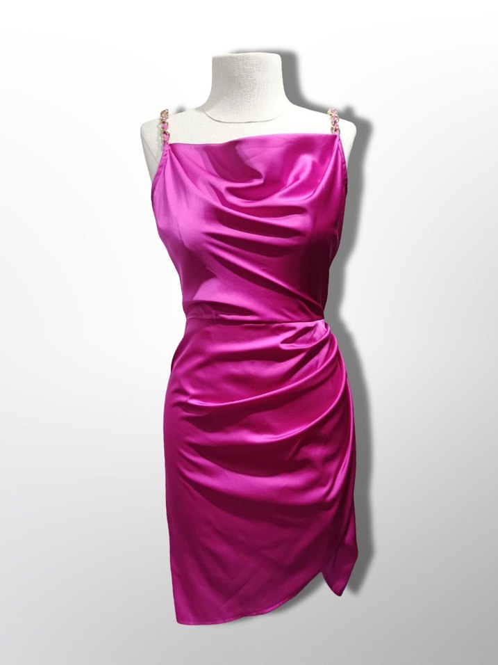 Parlak pembe kumaştan, drapeli detaylı ve askılı yaka tasarımlı, vücuda oturan mini abiye elbise.