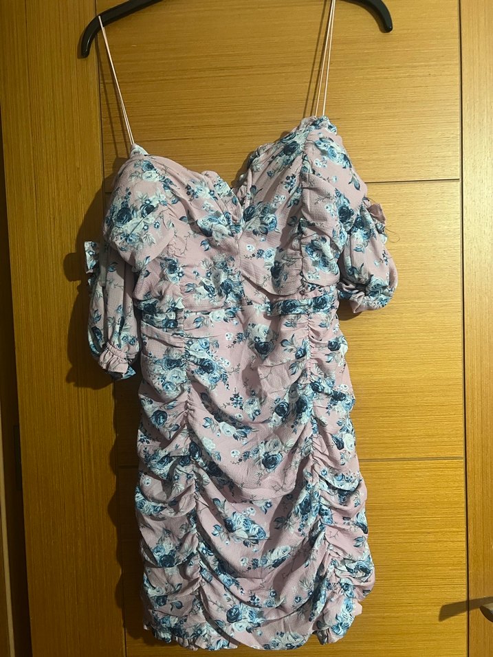 Pembe mini elbise, drapeli ve straplez yakalı, ince askılıdır. Pastel batik desenli, dar kesim ve romantik akşamlar için uygundur.