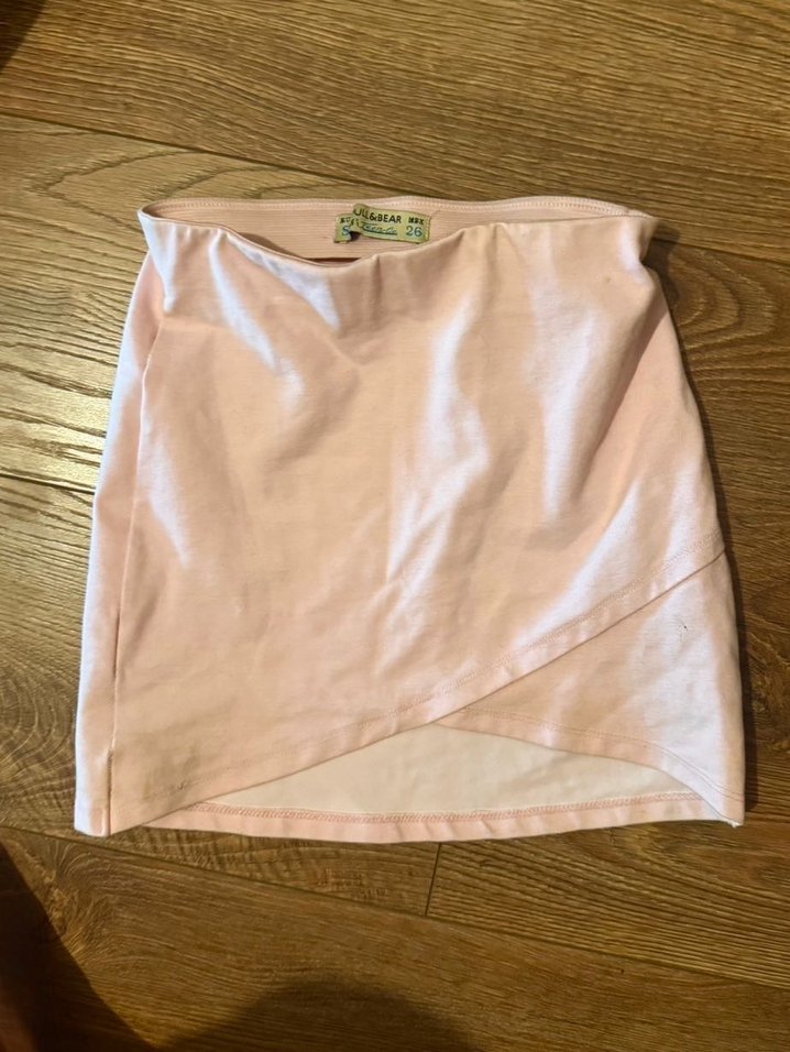 Pembe pastel renkte, drapeli ve saten dokulu, normal boyda ve vücuda oturan mini etek.