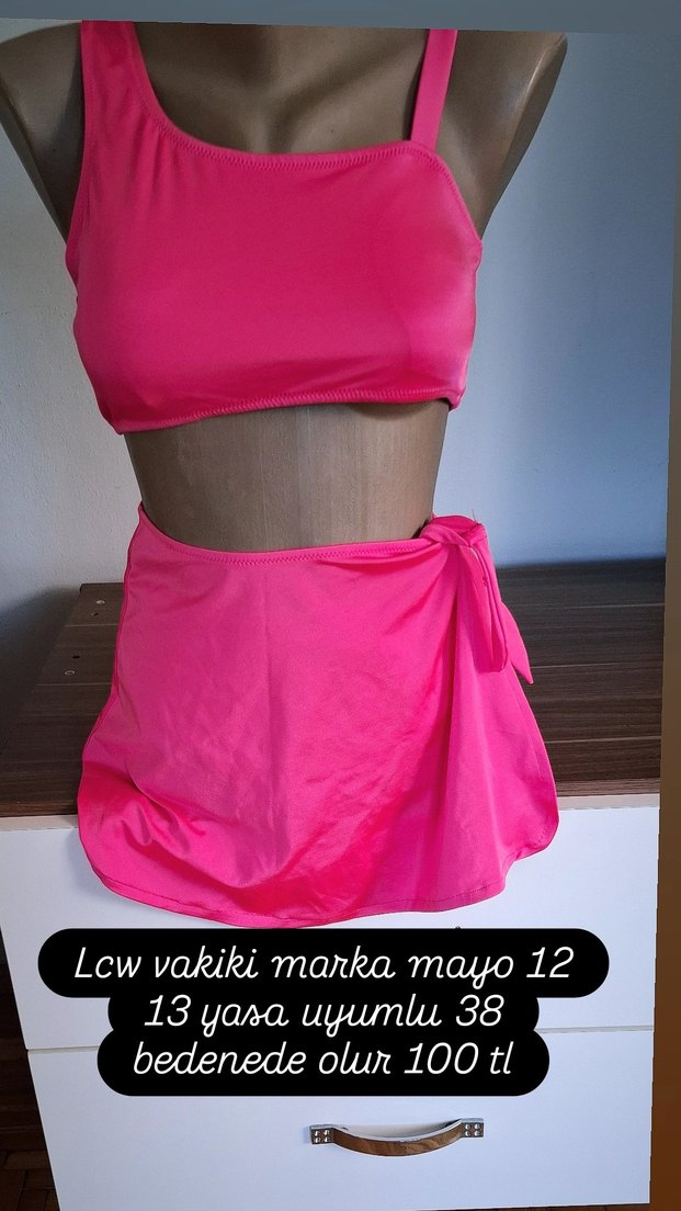 Canlı pembe renkte, drapeli ve kısa etekli, askılı, vücuda oturan LC Waikiki marka mayo takımı. 12 beden, 38 bedene de uyumludur. Sportif ve bohem tarzda. Fiyatı 100 TL.