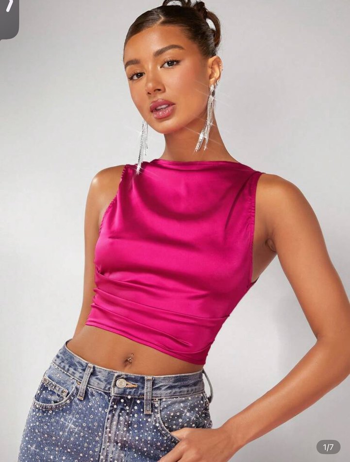 Drapeli tasarımlı, saten parlak kumaştan, kısa ve vücuda oturan, kayık yakalı, kolsuz pembe bluz. Romantik akşamlar için uygundur.