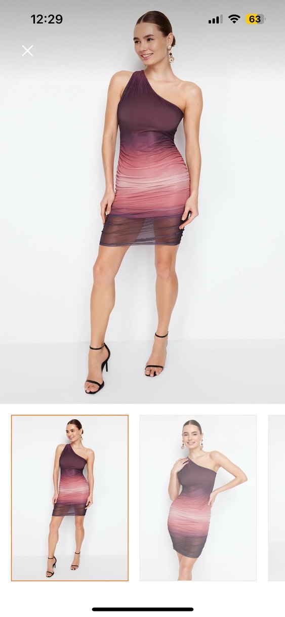 Fitted kesim, straplez ve ince askılı, drapeli tasarımlı mini elbise. Koyu pembe tie-dye desene sahip, romantik akşamlar için uygun. Hiç kullanılmadı.