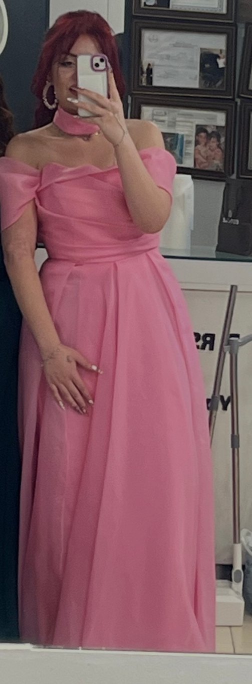 Pembe renkte, düşük kollu ve drapeli tasarıma sahip, uzun boyda ve fitted kesim elbise. Tek renk ve modern klasik tarzda, nişan için uygundur.
