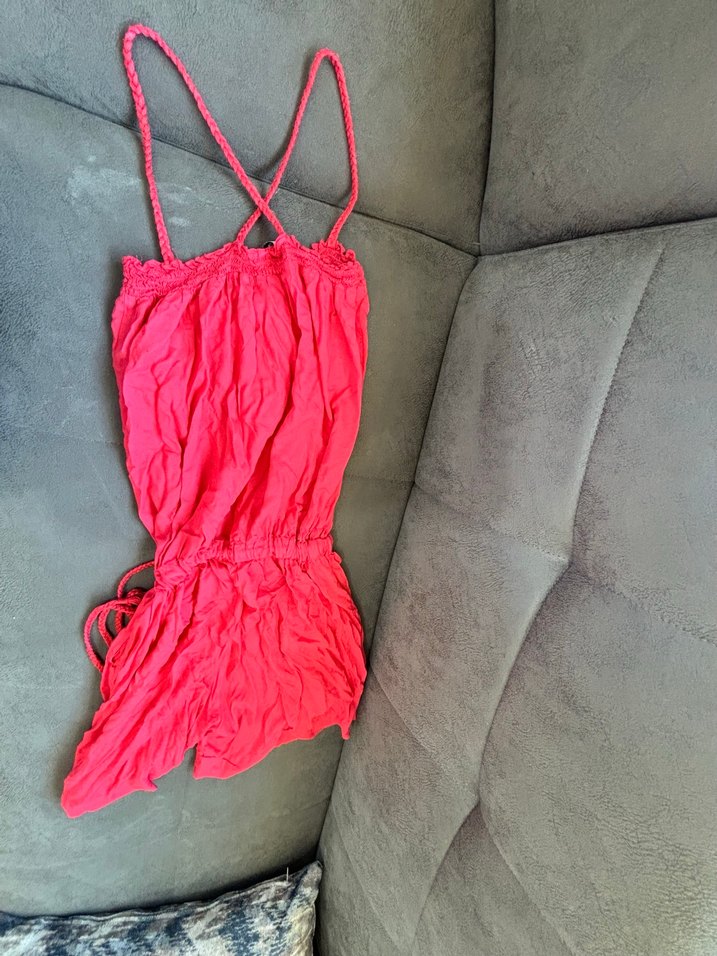 Nar çiçeği rengi , drapeli tasarıma sahip, askılı ve halter yakalı, renkli ve avangart tarzda şortlu tulum