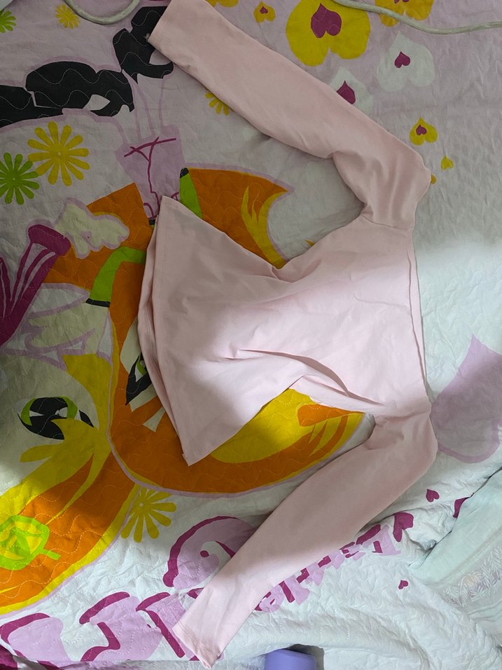 Pembe renkte, straplez yakalı ve uzun kollu, drapeli tasarıma sahip, sentetik kumaştan yapılmış, midi uzunlukta, dar kesim hamile bluzu.
