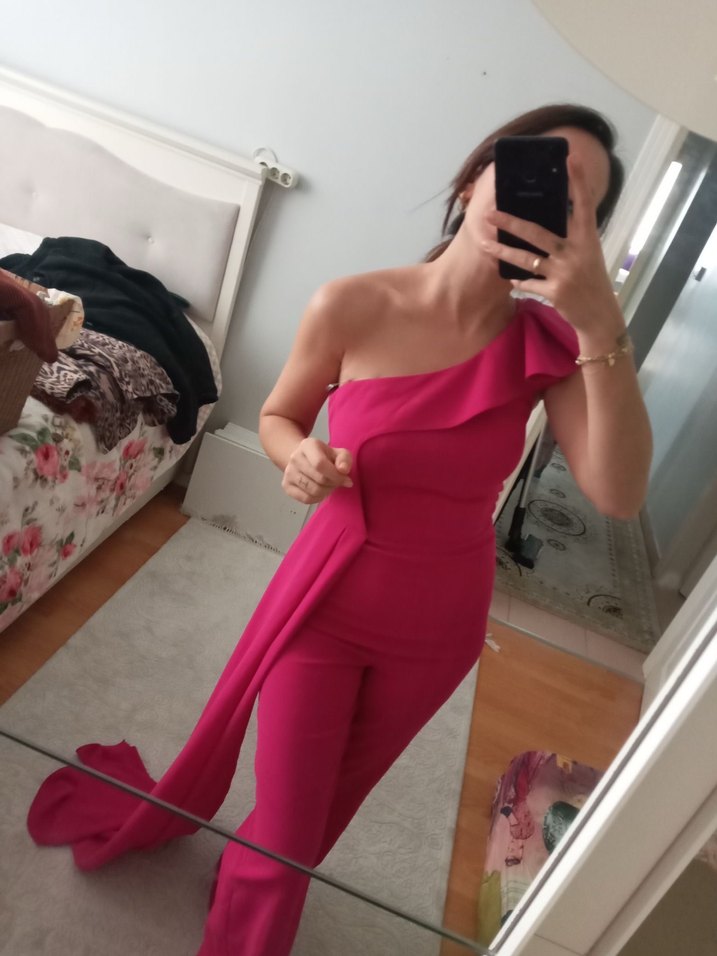 Pembe, straplez yaka ve drapeli detaylı, ipeksi kumaştan, midi boy, dar kesim kadın tulum. Parlak ve gösterişli parti için uygun. ✨