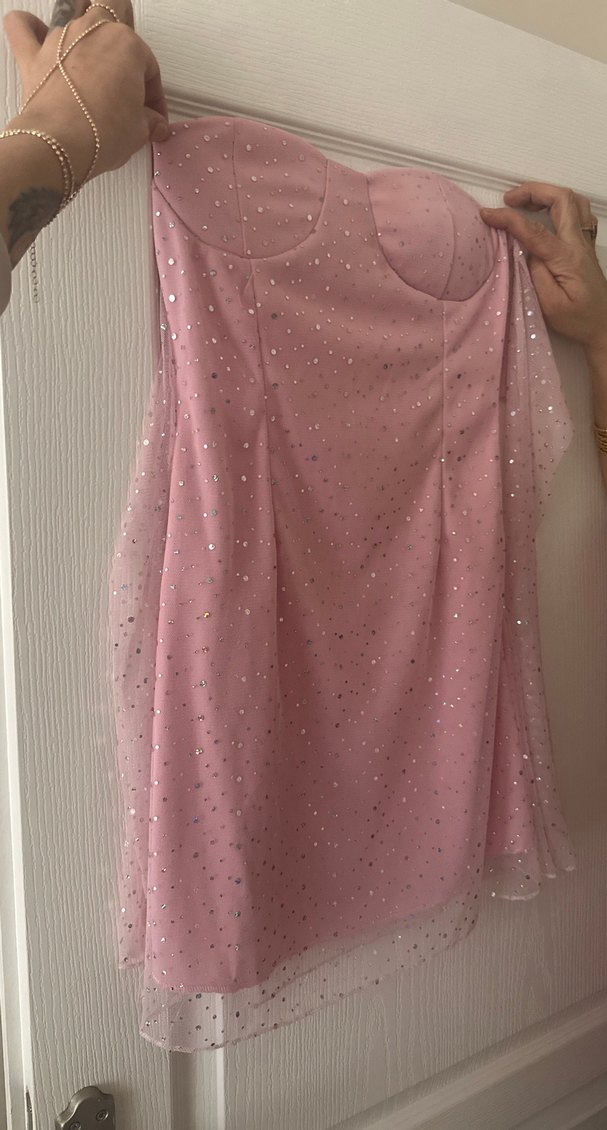 Pembe pastel tonlarında, straplez ve drapeli tasarıma sahip, simli detaylarla süslenmiş, midi boy ve kolsuz abiye elbise.✨