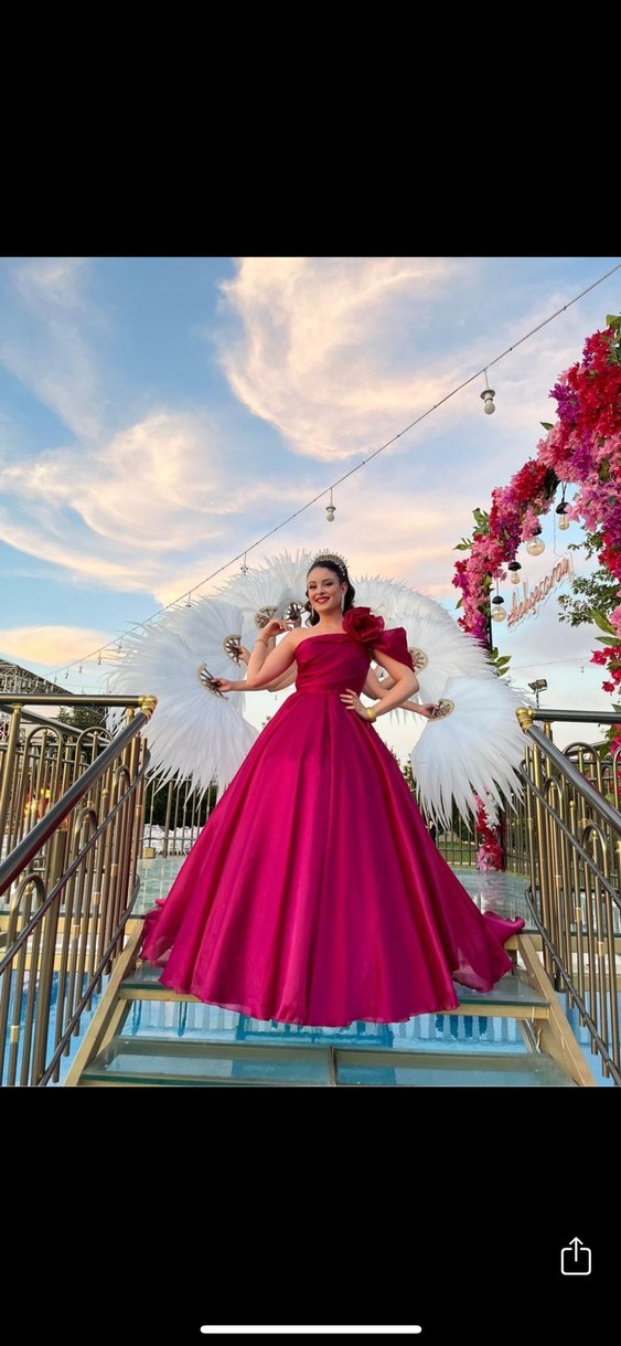 Pembe, drapeli ve straplez uzun abiye elbise, oturtmalı kesimi ve renkli baskılarıyla düğün için uygun, gösterişli ve pop kültür tarzında.