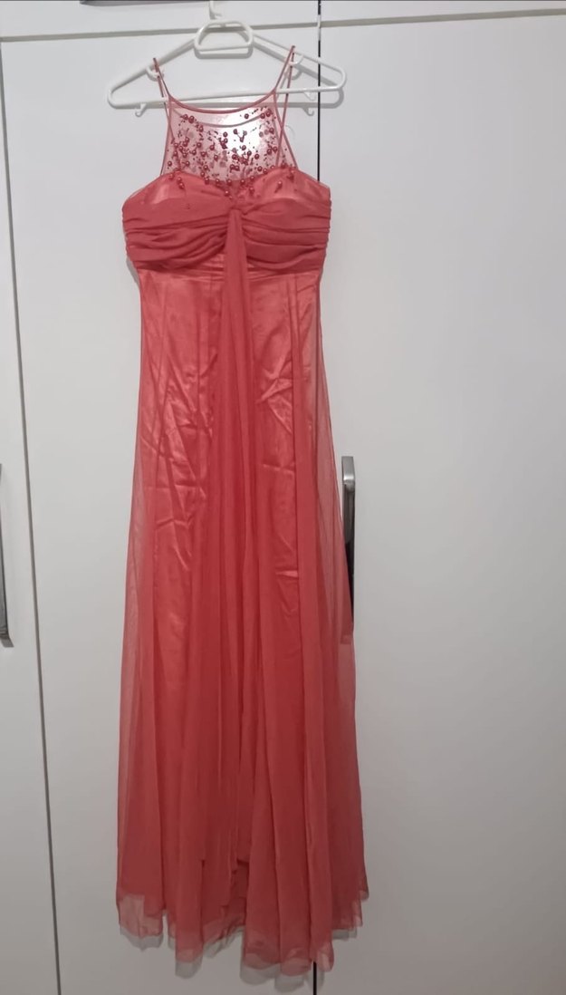 Pembe parlak kumaştan, straplez yaka ve drapeli detaylara sahip uzun, vücuda oturan abiye elbise.
