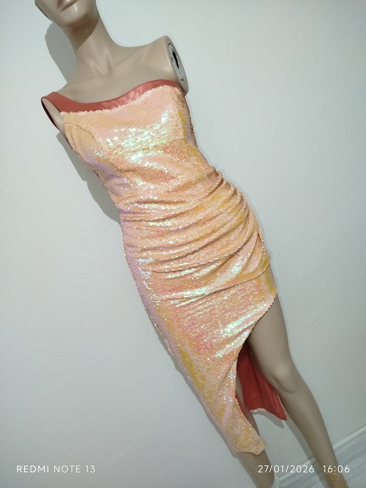 Pembe tonlarında bağlama desenli, drapeli ve straplez uzun kollu abiye elbise. Şık ve çağdaş kesimiyle parti için ideal. ✨