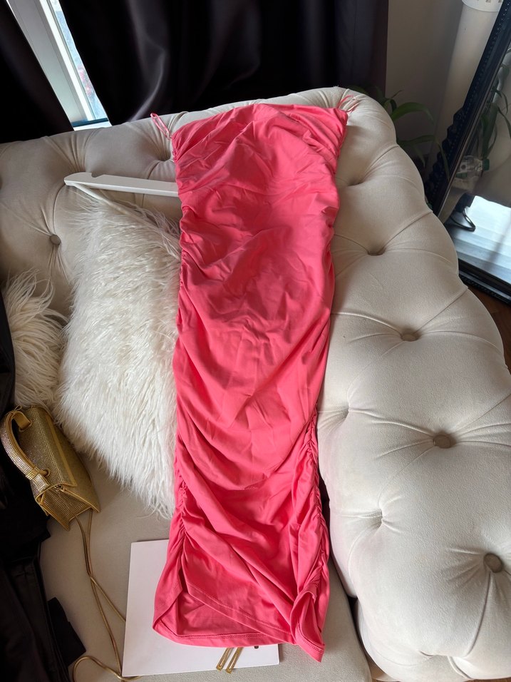 Pembe, parlak kumaştan, drapeli ve straplez uzun, kolsuz dar kesim gece elbisesi. Romantik akşamlar için uygundur.
