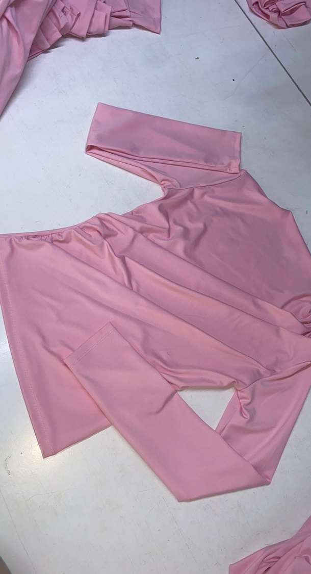 Pembe pastel renkte, drapeli ve straplez yakalı, uzun kollu ve vücuda oturan kadın spor üstü. Sentetik kumaştan yapılmış, rahat ve şık bir günlük kullanıma uygun parça. Bedenleri vardır