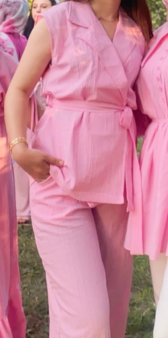 Pembe pastel renkte, V yakalı ve askılı kollu, drapeli tasarıma sahip satenimsi alt-üst takım Normal kesim, düğün ve günlük kullanım için uygun.