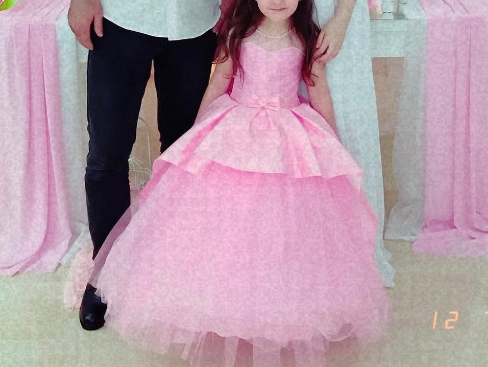 Pastel pembe renkte, straplez, drapeli ve kat kat etekli kız çocuk abiyesi. Kendinden tarlatanı olup kabarık modeldir. Yüksek bir fiyata alınmıştır.