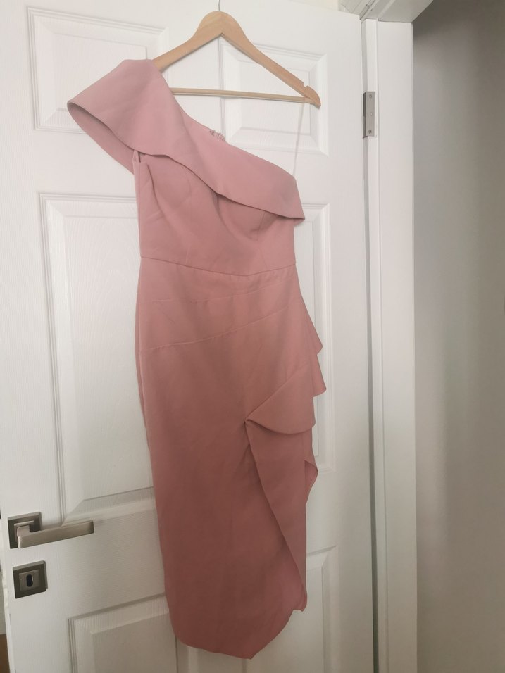 Bu pembe drapeli, tek omuz abiye elbise, modern ve şık bir görünüm sunar. Düğünler için uygundur.