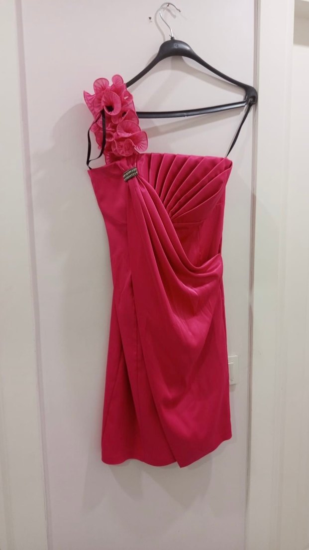 Pembe renkte, drapeli ve tek omuzlu çiçek detaylı askılı, straplez yakalı, uzun ve vücuda oturan abiye elbisedir. Düğün gibi özel etkinlikler için uygundur.
