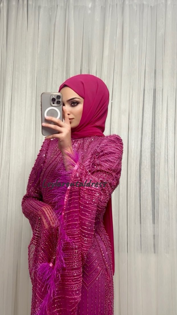 Drapeli detaylara sahip, etnik desenli koyu pembe uzun ve vücuda oturan abiye elbise. Uzun kollu ve straplez yakalı, düğünler için uygun.