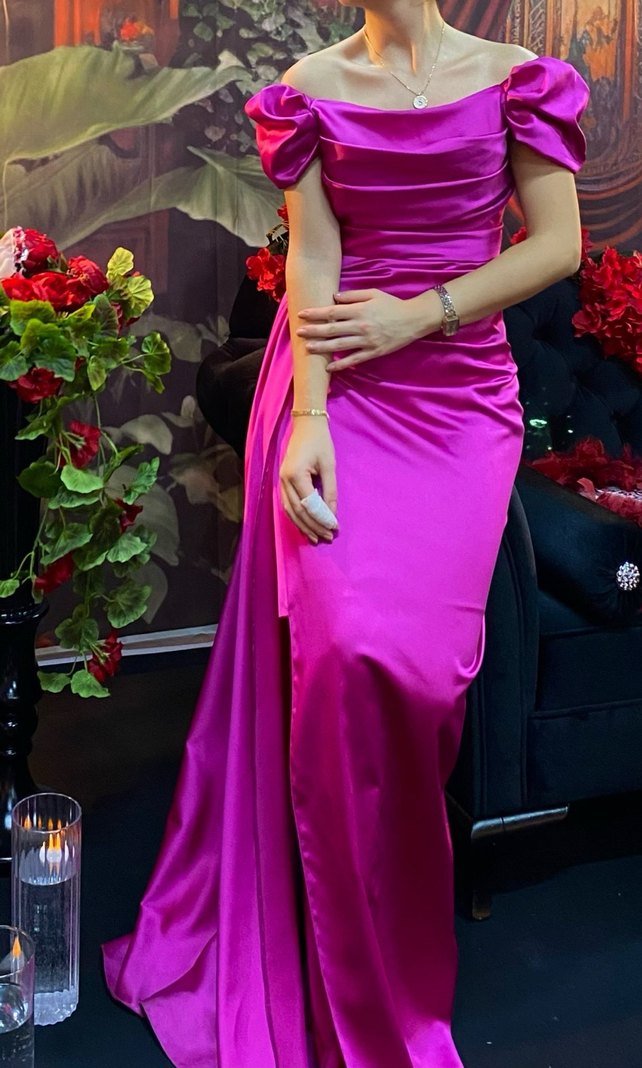Pembe parlak kumaştan, drapeli ve uzun kesim abiye elbise. Kayık yaka ve ince askılarıyla klasik şıklık sunar.