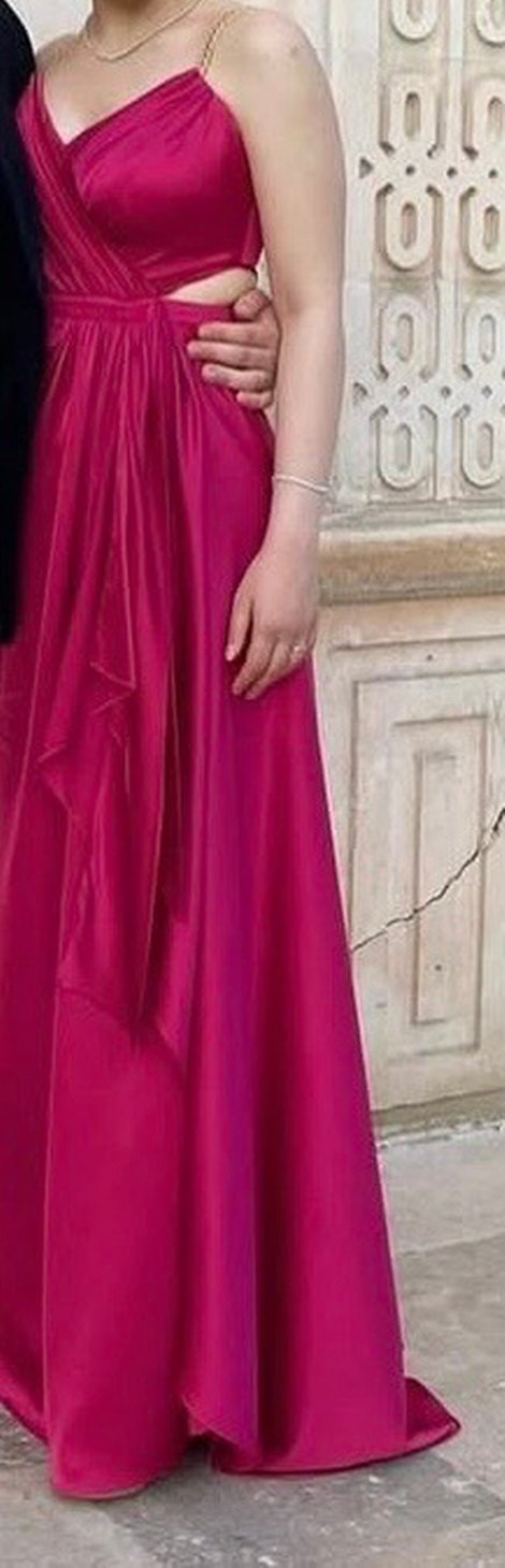 Pembe, drapeli uzun elbise, V yakalı ve ince askılı, şık bir düğün için uygundur. ✨ Kuru temizleme yapılmıştır, tadilatsızdır. 1 kere kullanıldı 36-38 bedene uyumludur.