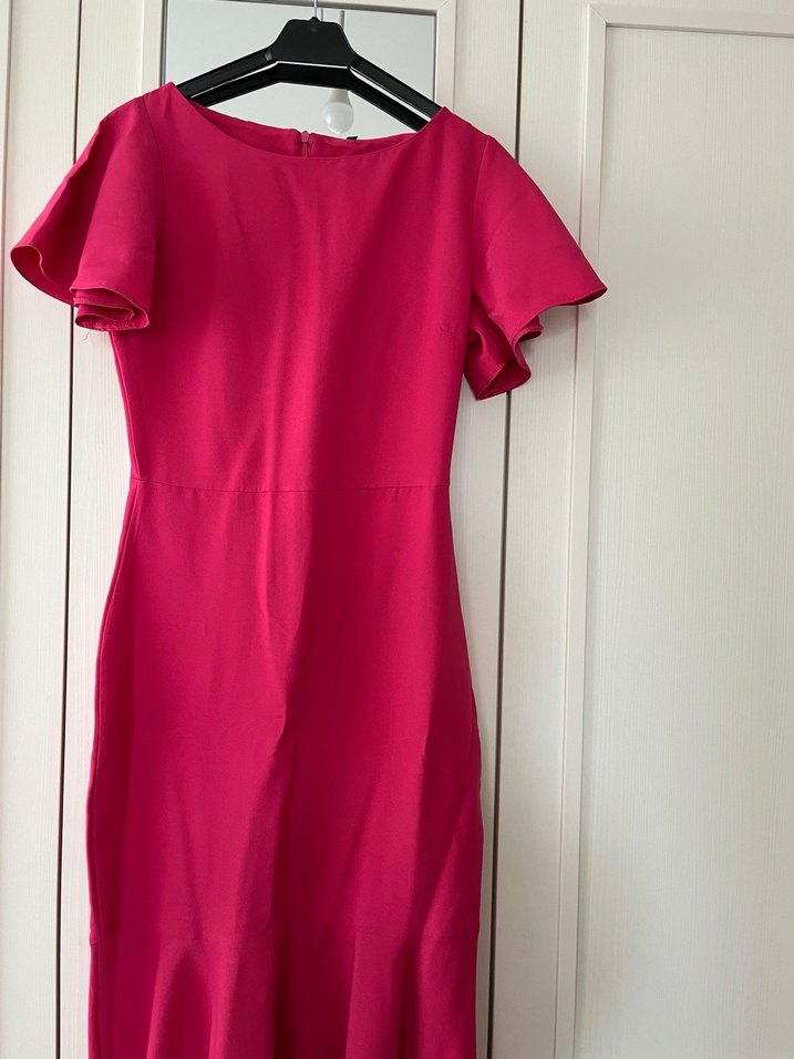 Pembe renkli, uzun ve vücuda oturan abiye elbise, kısa kollu ve V yakalı drapeli tasarıma sahiptir, modern ofis kullanımı için uygundur. ✨