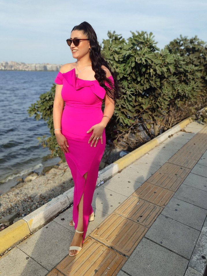 Pembe parlak tonlarda, straplez yaka ve drapeli detaylara sahip, uzun ve dar kesim abiye elbise. İnce askılı kollarıyla romantik akşamlar için uygundur.