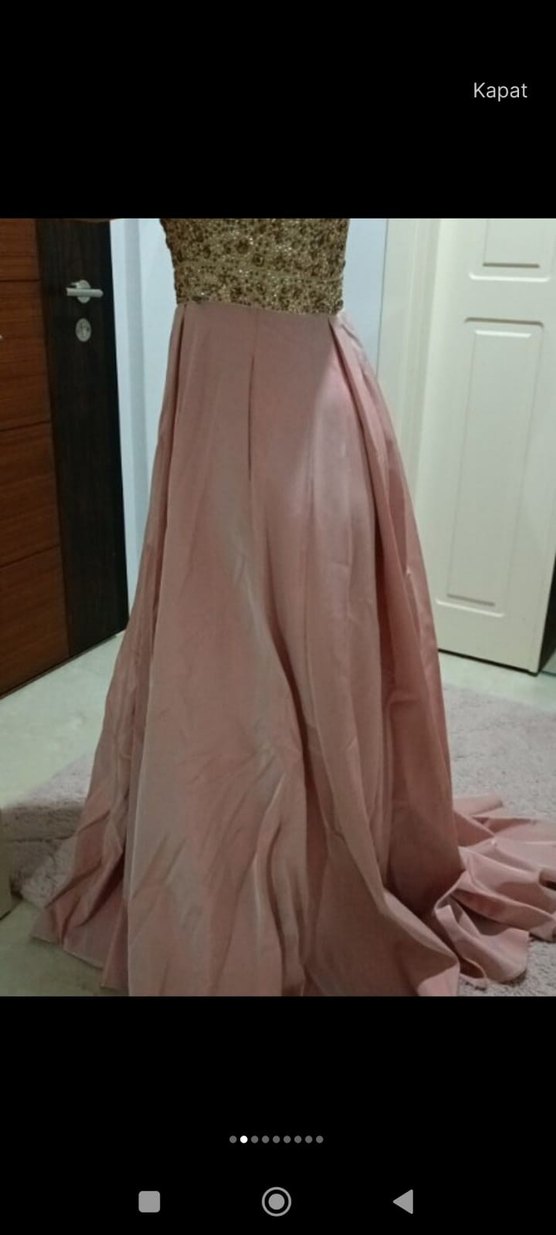 Pastel pembe renkli, V yaka ve kolsuz, bol kesim uzun elbise. Drapeli etek detayıyla çağdaş bir tarz sunar, düğünler için uygundur.
