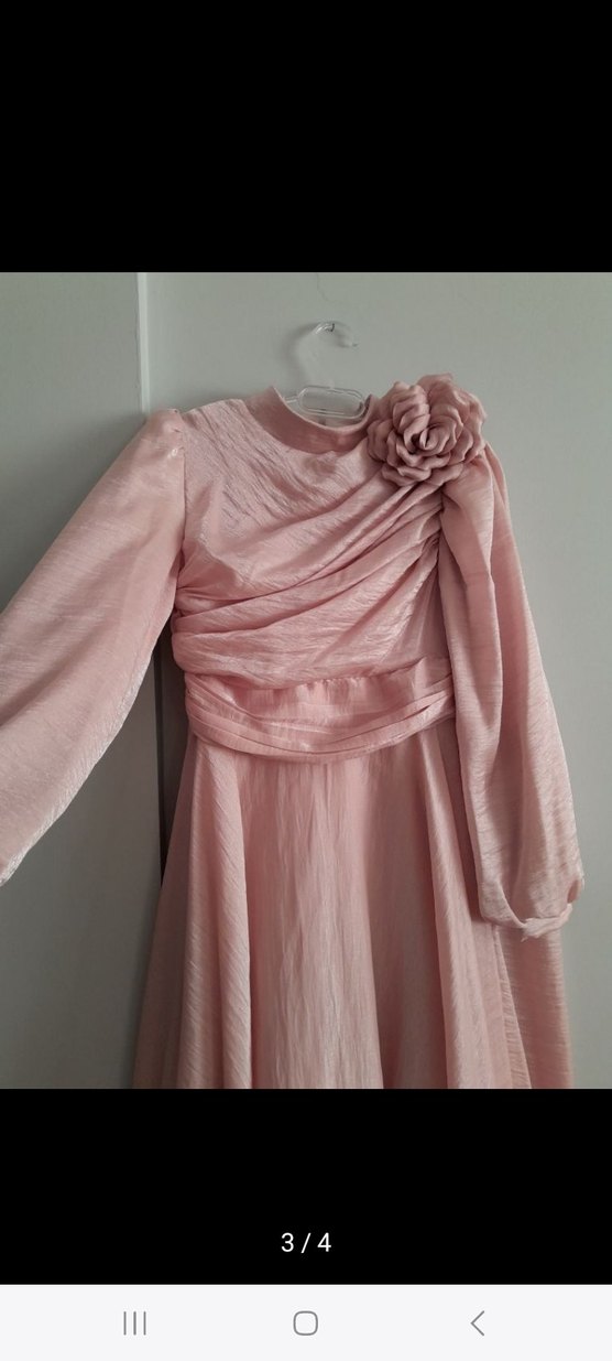 Pastel pembe uzun abiye elbise, yüksek yakalı ve omuzda çiçek detaylı drapeli tasarıma sahiptir. Uzun kollu ve bol kesimdir, düğünler için uygundur. Bir kere giydim. Pazarlık payı vardır.