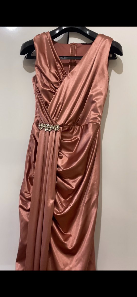 Pembe, straplez, uzun ve drapeli bu abiye elbise, fitted kesimi ve parlak dokusuyla düğünler için uygundur.