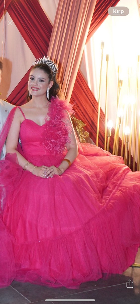Pembe renkte, drapeli detaylara sahip uzun abiye elbise. İnceltici kesimi, askısız yakası ve renkli batik deseniyle klasik zarafeti yansıtıyor. Kollu değil, göz alıcı bir tasarım.