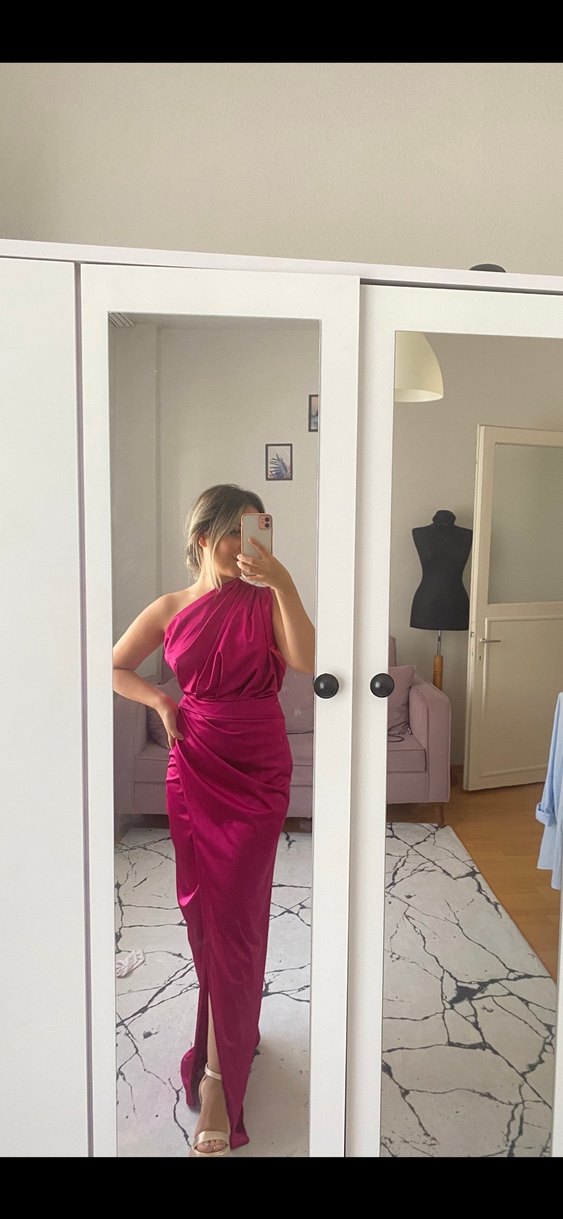 Bu pembe parlak kumaştan, drapeli ve straplez uzun abiye elbise, vücuda oturan kesimiyle romantik akşamlar için uygundur. ✨