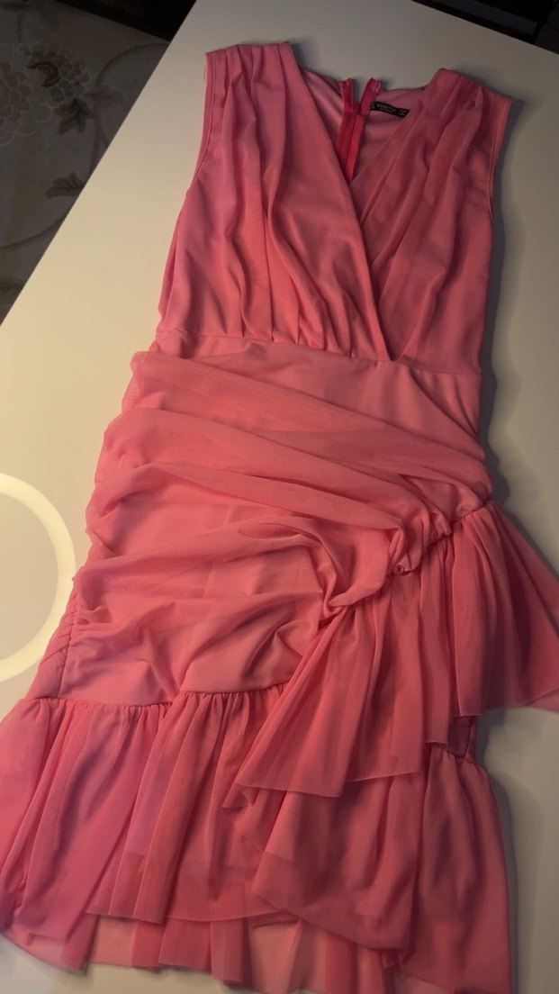 Pembe pastel renkte, V yaka ve ince askılı, drapeli uzun ve vücuda oturan bohem tarzda abiye elbise. Düğün için uygun.