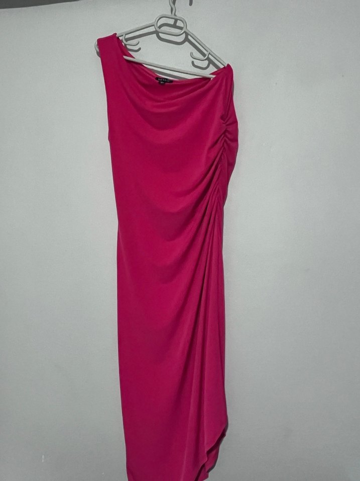 Drapeli ve straplez tasarıma sahip, pembe uzun abiye elbise, romantik akşamlar için şık ve vücuda oturan kesimde. Yurt disindan geldi Az kullanilmis fusya tek kol elbise