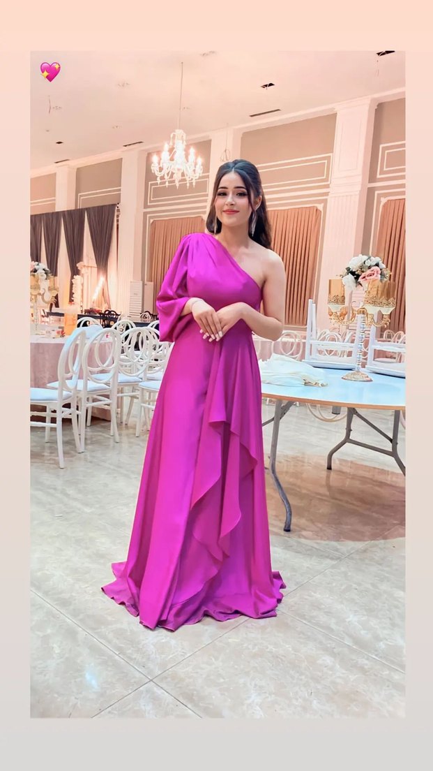Pembe renkli , drapeli uzun abiye elbise. Straplez yakalı, kolsuz ve parlak desenlidir. Düğünler için çağdaş ve şık bir tasarım sunar.
