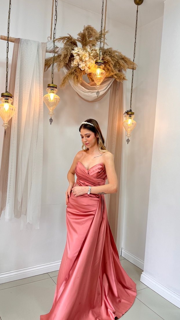 Pembe straplez uzun abiye elbise, drapeli tasarımı ve ince askılarıyla parlak bir görünüme sahiptir. Düğünler için modern klasik stil ve regular fit sunar.