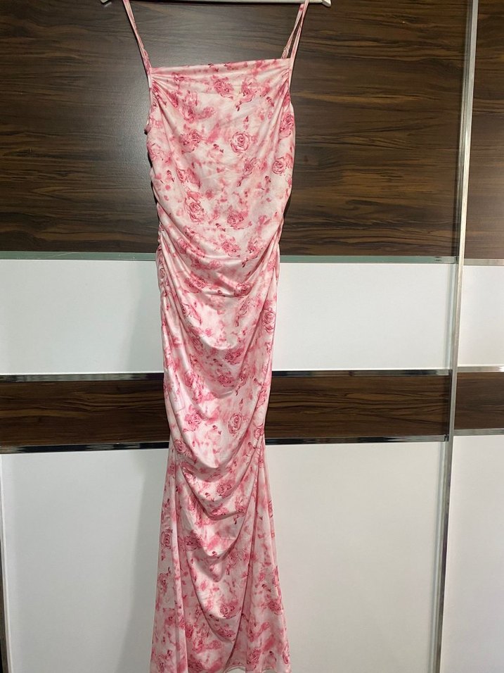 Pembe, drapeli ve askılı uzun elbise, pastel tonlarda tie-dye desenli ve vücuda oturan kesime sahiptir. Yumuşak sentetik kumaştan yapılmıştır. L-xl uyumludur