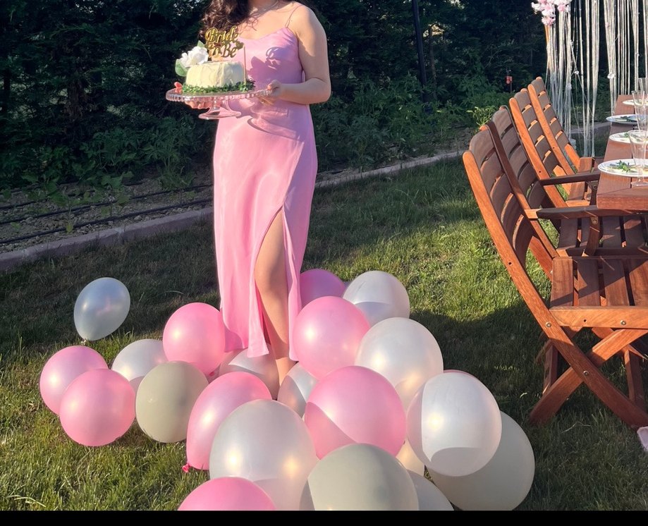 Pembe renkte, drapeli detaylı ve yırtmaçlı, straplez uzun elbise. Gösterişli partiler için uygun, vücuda oturan kesim. M/38 beden bir kez bride to be için giyildi .