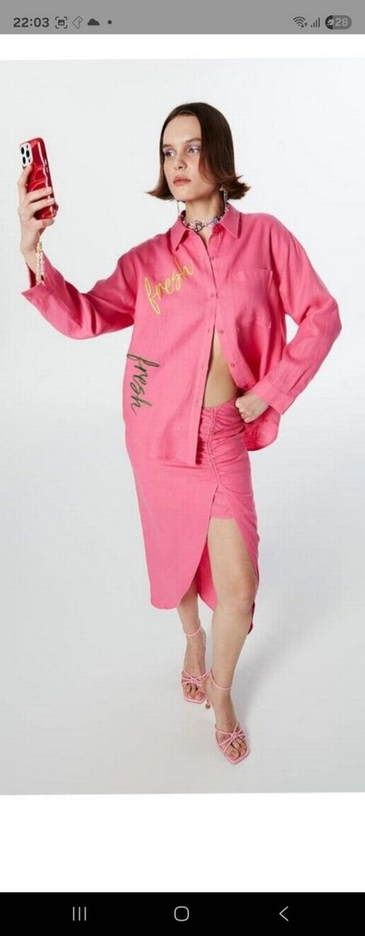 Nefes alabilen keten kumaştan yapılmış, bol kesim pembe uzun hamile eteği, drapeli ve baskılı detaylara sahiptir. Sokak modası ve partiler için uygundur. 1 kez kullandım.