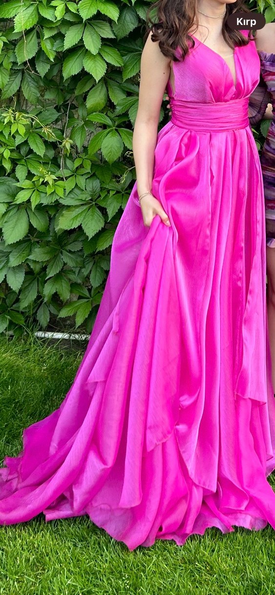 Parlak pembe renkte, ve askılı kollu, drapeli uzun kesim kadın abiyesi, modern düğünler için uygun.