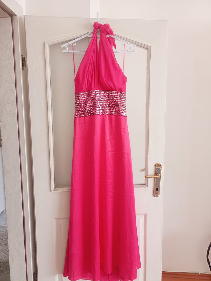 Fitted kesim, uzun pembe abiye elbise, drapeli tasarımı ve kolsuz V yaka detayıyla romantik akşamlar için uygundur. Parlak kumaşı çağdaş bir hava katar.