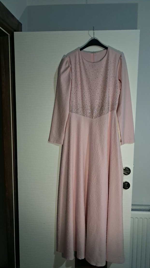 Drapeli tasarıma sahip uzun pembe abiye elbise, uzun kollu ve yuvarlak yakalıdır. Gevşek kesimi ve pastel tonu ile düğünler için uygundur. Modern klasik ve vintage stil sunar.