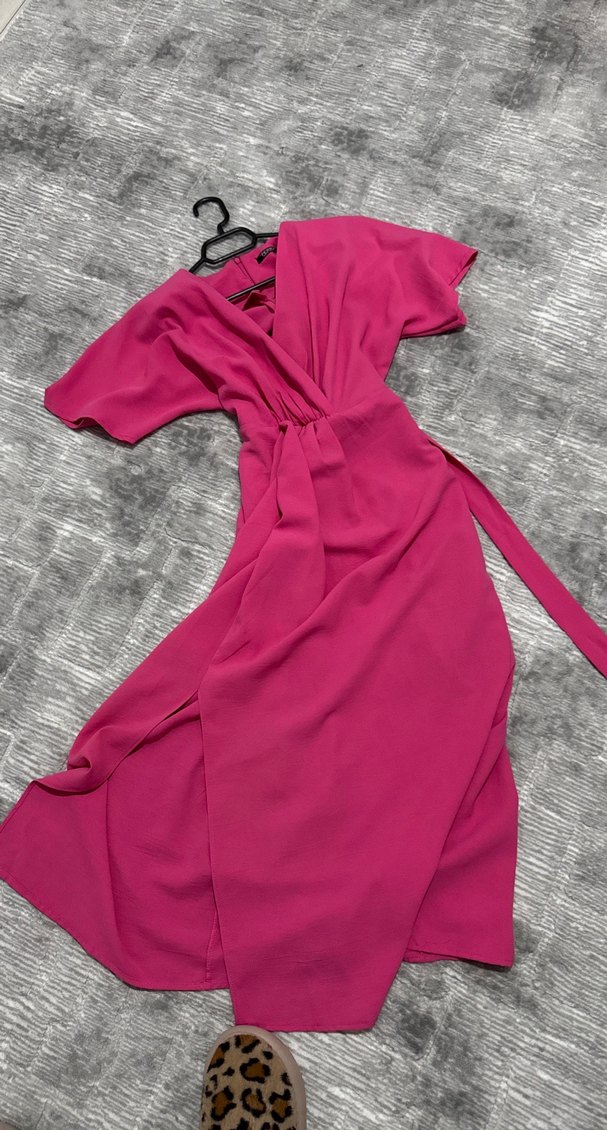Pembe uzun elbise, drapeli tasarım, V yaka ve askılı kollara sahiptir. Rahat kesimli ve sentetik yumuşak kumaştandır, günlük kullanım için uygundur. Rengi cok tatliiii bir kere giydimmm alın aldırınnn